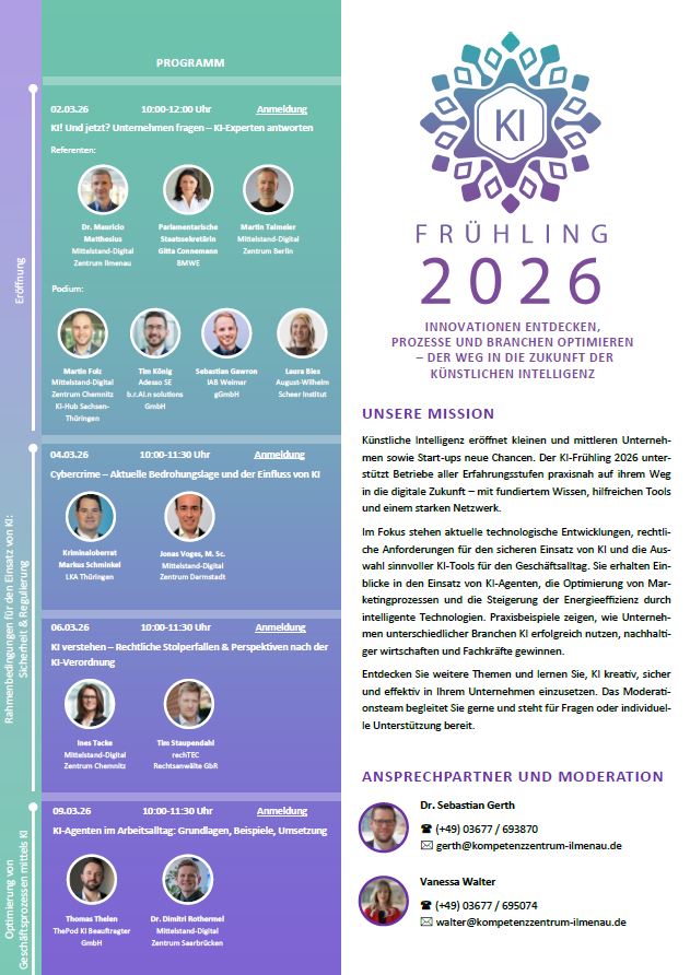 Künstliche Intelligenz ist ein Thema für Einsteiger und Fortgeschrittene in KMU und Start-ups mit unterschiedlichen Voraussetzungen. Unsere Mission ist es, Unternehmen praxisnah und nachhaltig auf ihrem Weg in die digitale Zukunft zu begleiten. Der KI-Frühling 2026 vermittelt Werkzeuge, Wissen und Netzwerke, um die Potenziale Künstlicher Intelligenz erfolgreich zu nutzen. Sie lernen u.a. relevante Regulierungsvorschriften, cybersicherheitsrelevante Aspekte und die sinnvolle Integration von Chatbots kennen. Praxisnahe Beispiele zeigen den Weg von der Idee bis zur Umsetzung und beleuchten die Rolle von KI bei der Fachkräftegewinnung sowie der Optimierung von Energiekosten. Wenden Sie sich gern im Nachgang an die Moderatoren, um Ihr KI-Projekt gemeinsam anzugehen.